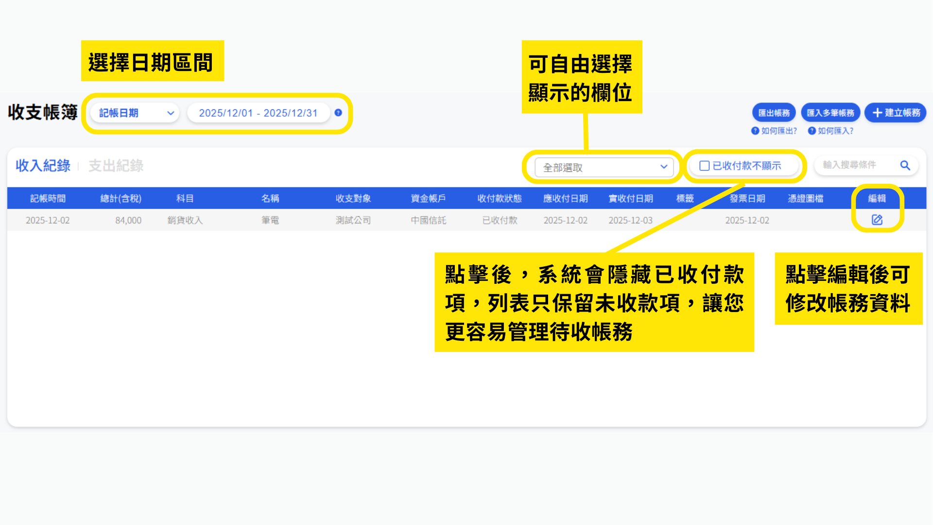 | 未收付款 (應收付日期) | 輸入這筆款項「預計收款」的日期。 | ▶如何查看應收應付? |