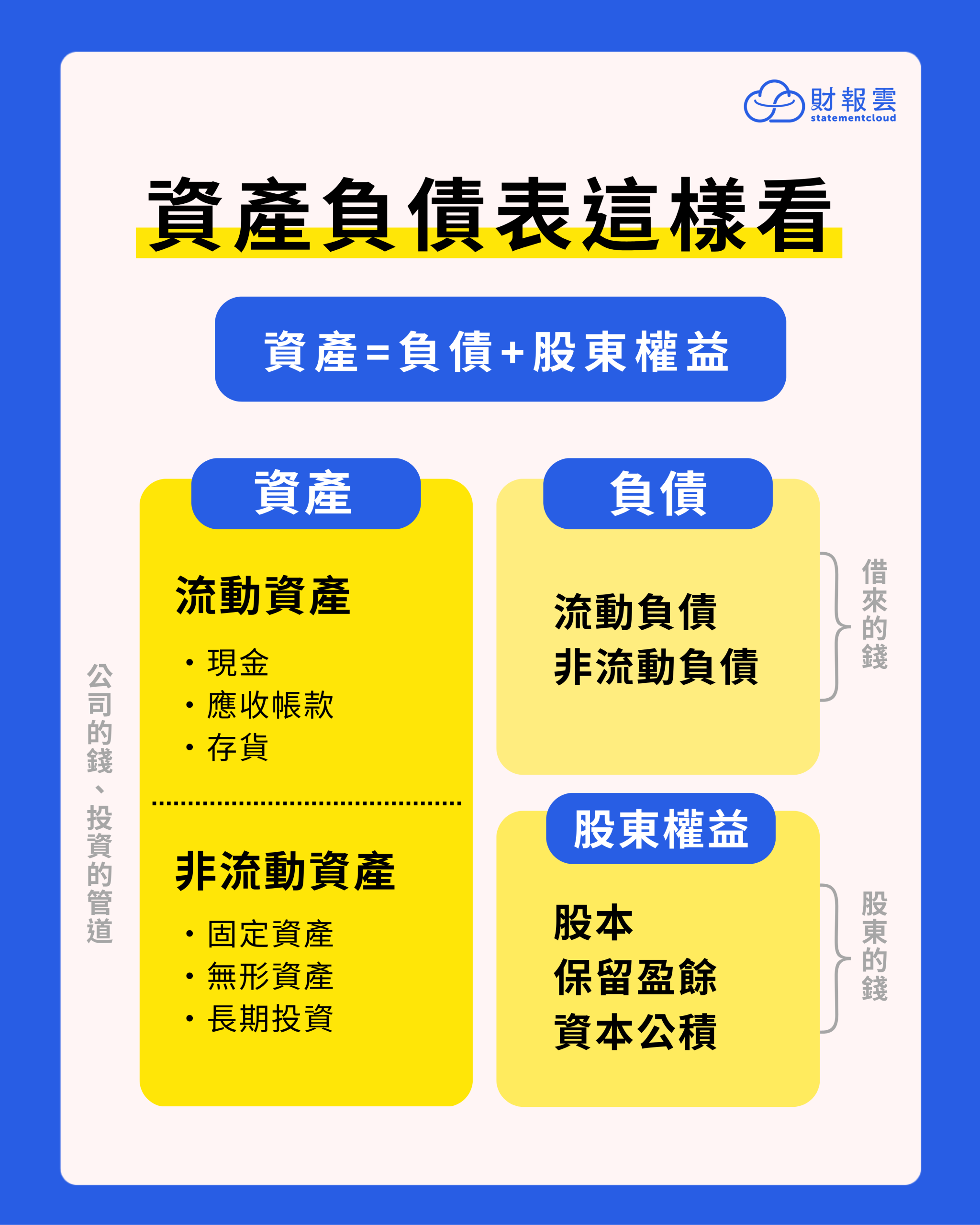 資產負債表的架構,可以用一個基本公式來說明: