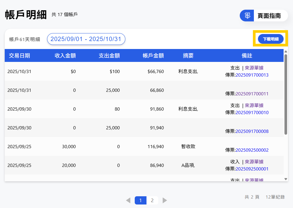 選擇日期區間後,可點擊下載帳戶明細。