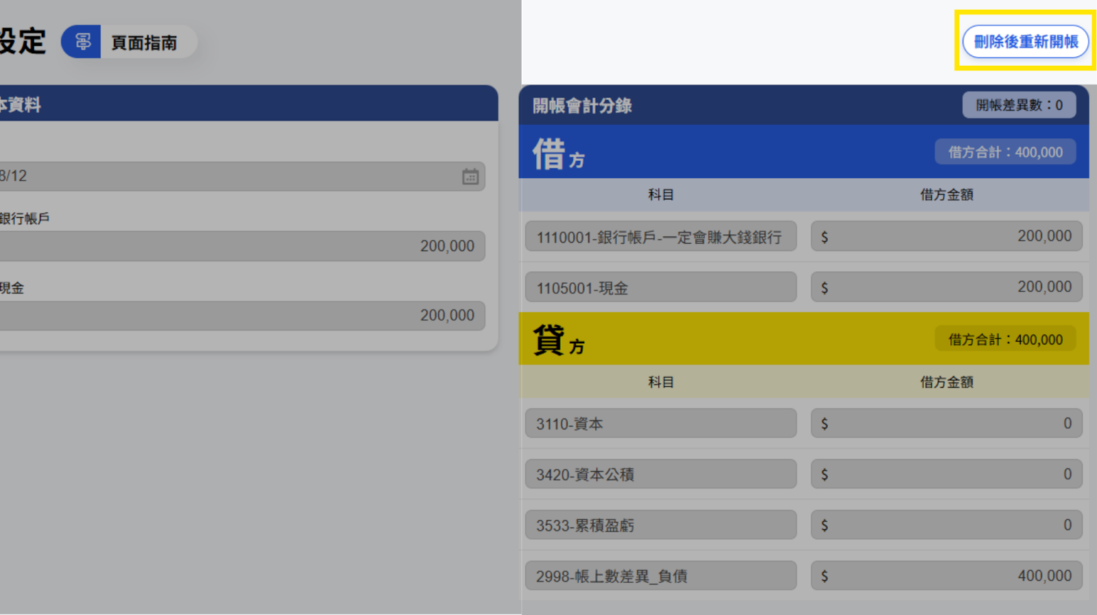 小提醒:畫面右側的借貸方分錄(藍色/黃色區塊)和「開帳差異數」可以忽略,財報雲系統會自動處理。