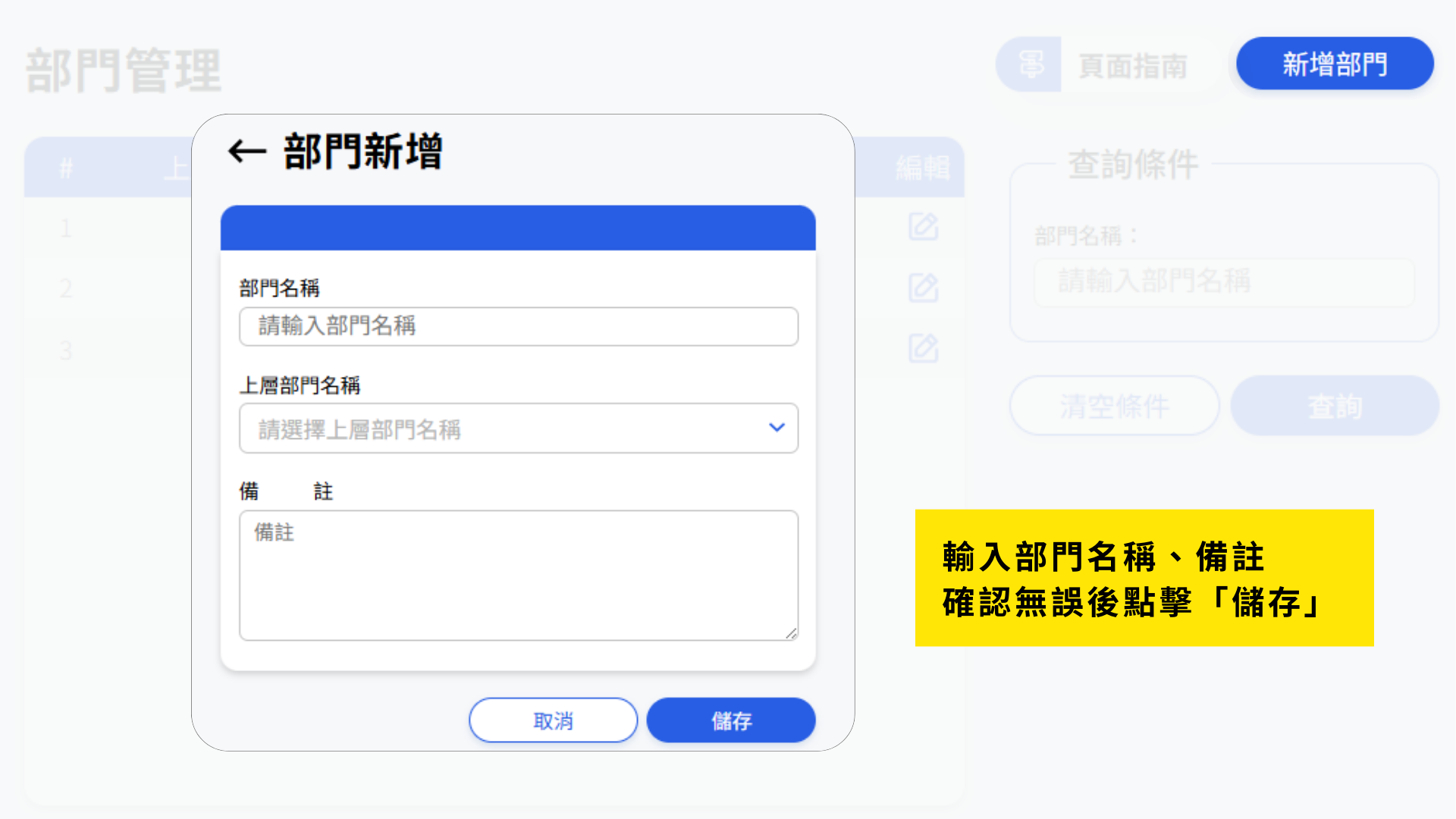 點選右上角的「新增部門」,輸入部門名稱、備註,確認無誤後點擊「儲存」。