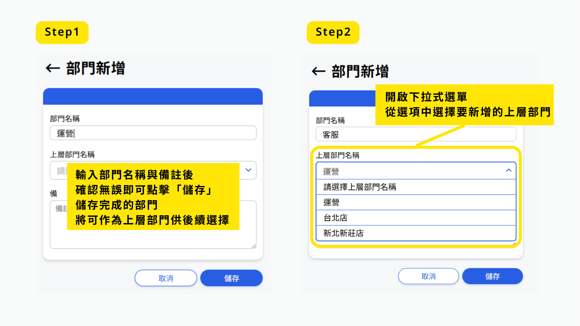 舉例來說,若上層部門為「運營」,下層部門包括「客服」與「行銷」,則必須先建立「運營」部門。完成儲存後,再新增其他部門,例如「客服」,並將其上層部門設定為「運營」,即可完成上層與下層的部門建立。