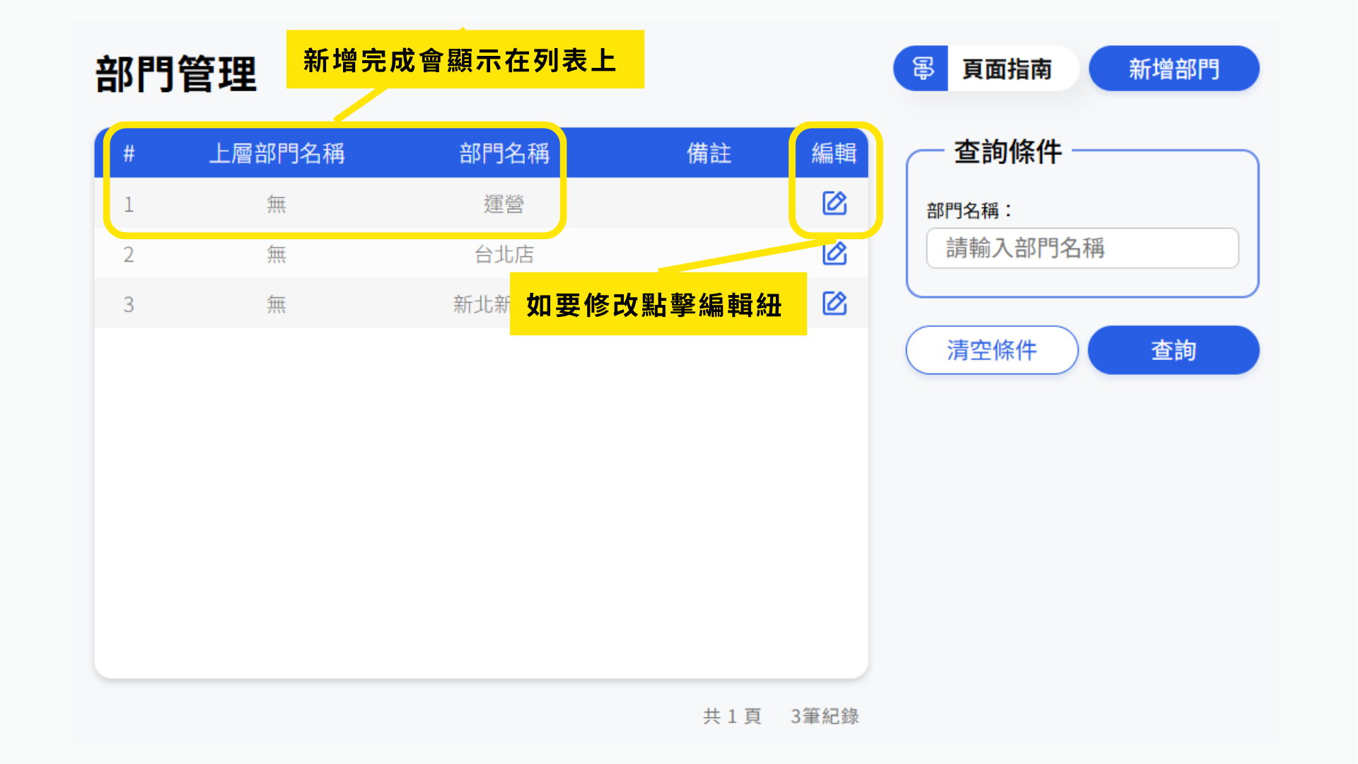 儲存完成後,可在部門列表中檢視已建立的部門。如資料有誤,亦可點選部門進入編輯進行修改。