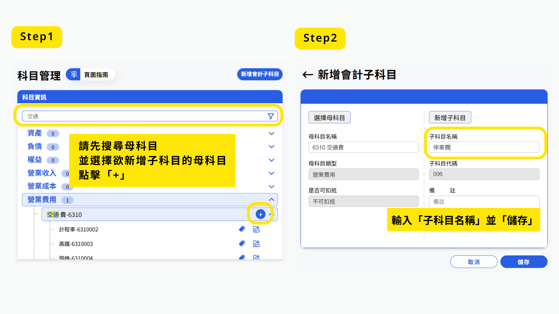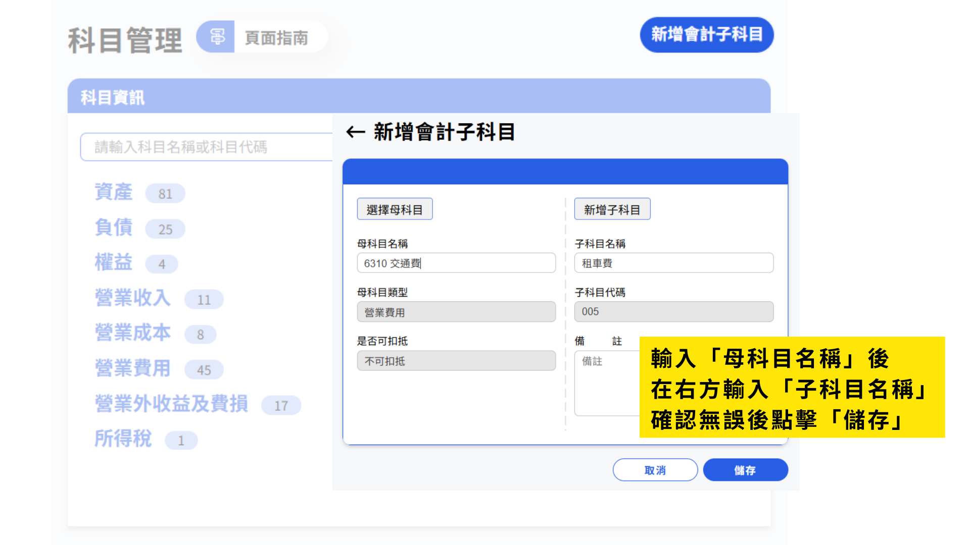 方法一:請點擊「新增會計子科目」,於左方輸入母科目名稱,並在右方填寫欲為該母科目新增的子科目,確認後儲存即可完成設定。