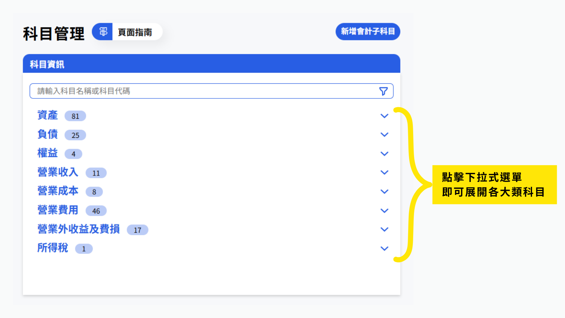 科目列表會顯示所有科目,點擊下拉式選單即可展開並查看各項科目內容。