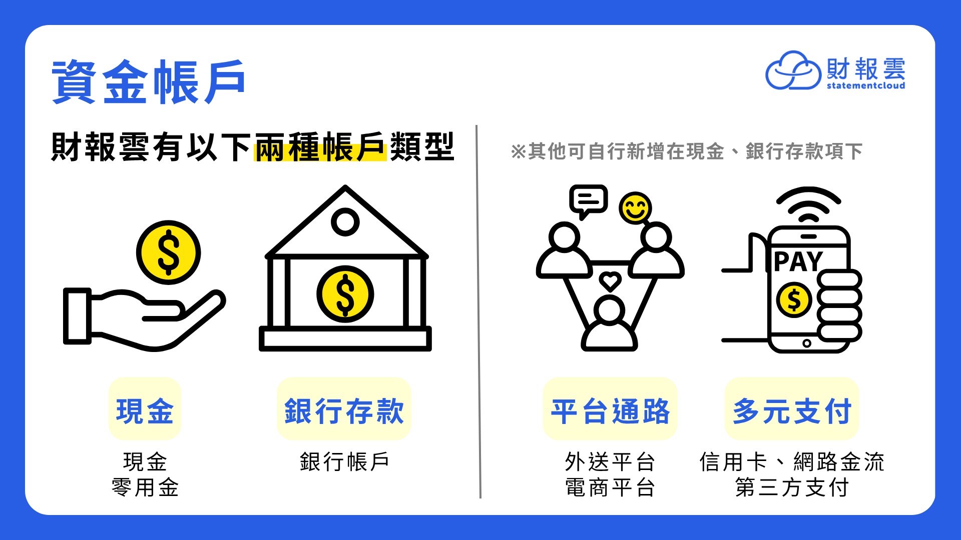 財報雲的資金帳戶可以分成兩種類型,分別是:現金、銀行存款