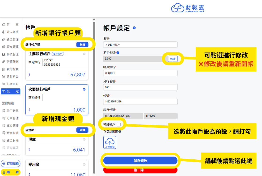 初期財報雲會預設一個銀行帳戶和一個現金帳戶,可依需求做修改。如要新增更多帳戶請在右方點擊新增。並可將常用帳戶/現金類修改為預設帳戶。
