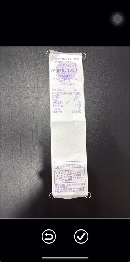 ③ 將相機對準要拍的憑證,出現偵測邊框後,按下打勾 ✔