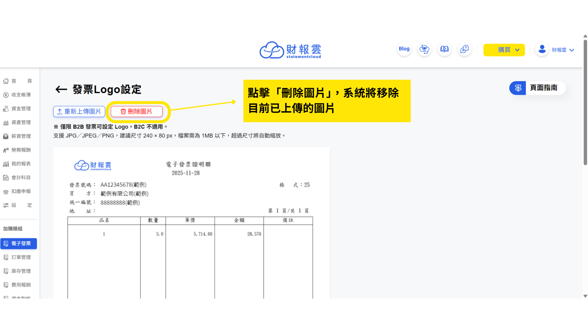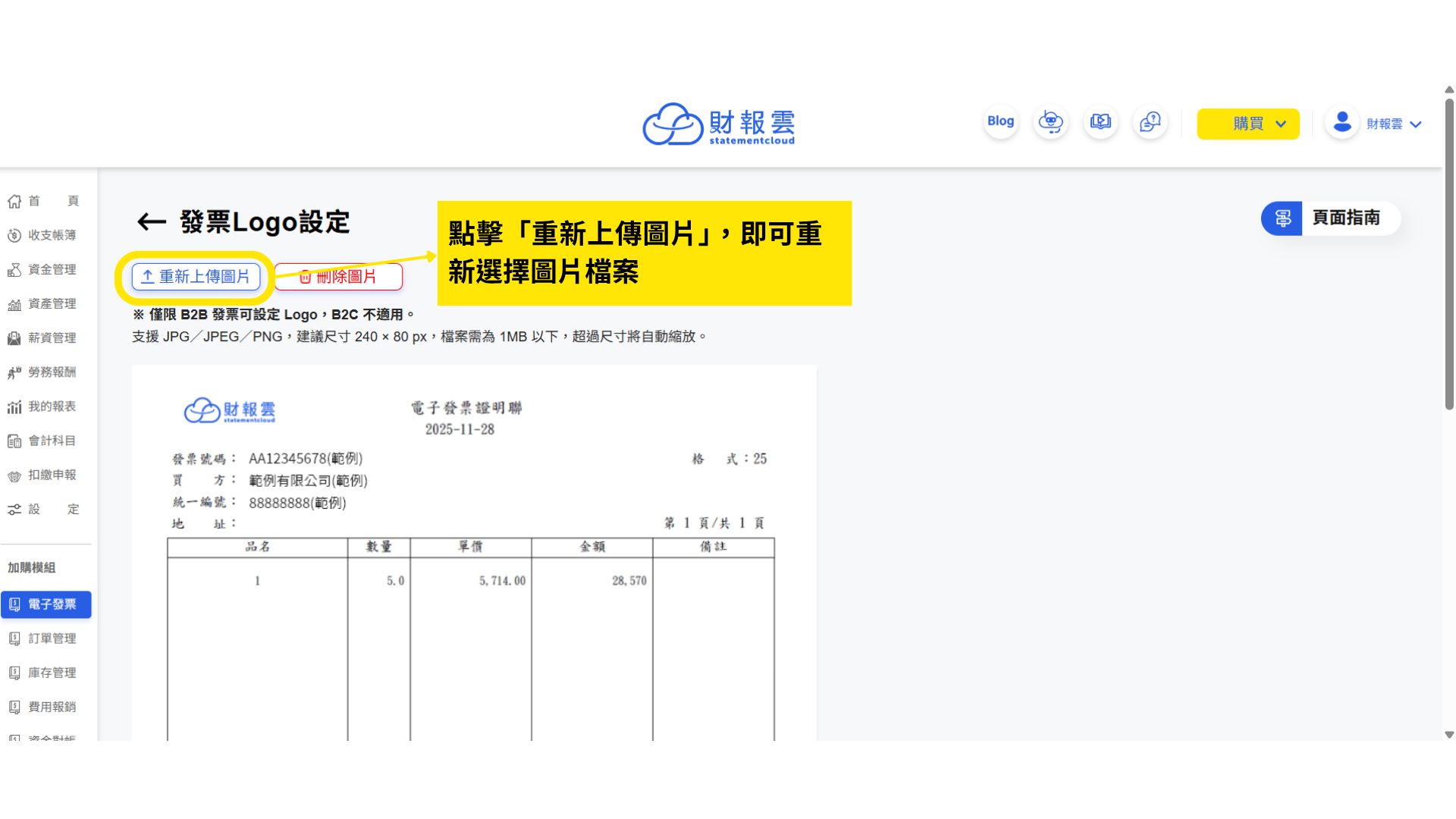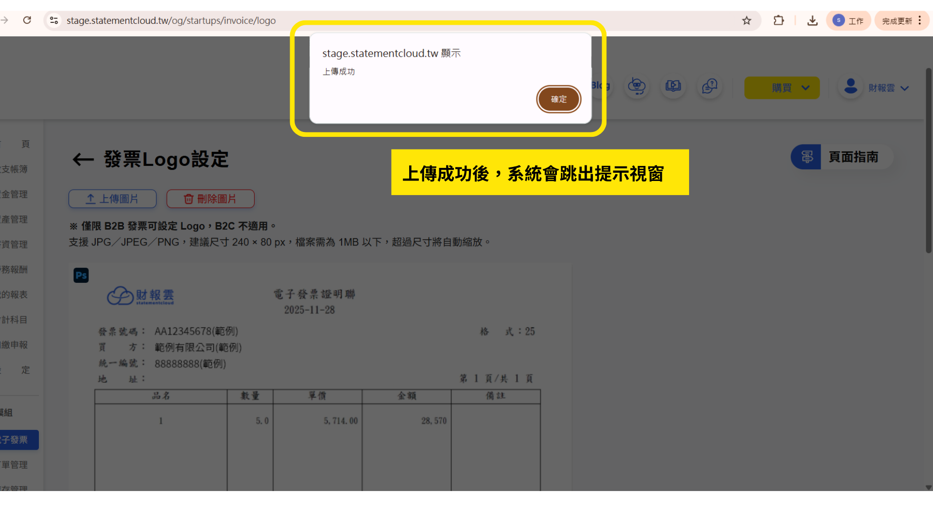 上傳完成後,系統會自動在下方顯示發票預覽,您可以確認 Logo 的顯示位置與效果。