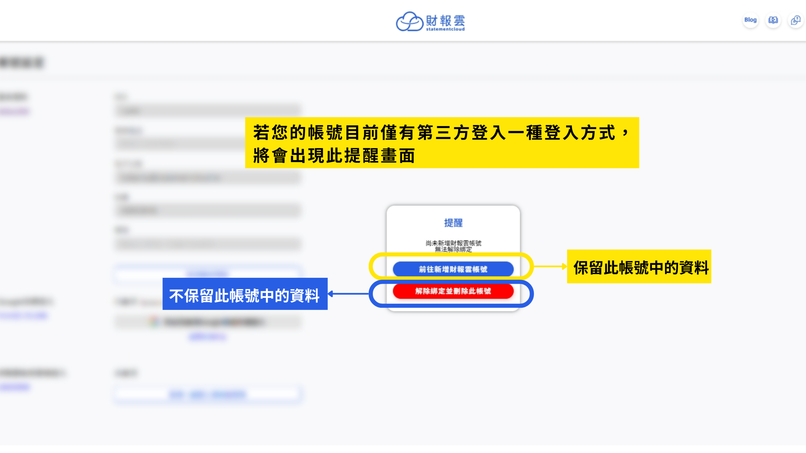 若您的帳號目前僅有第三方登入一種登入方式,系統將會跳出提醒視窗,