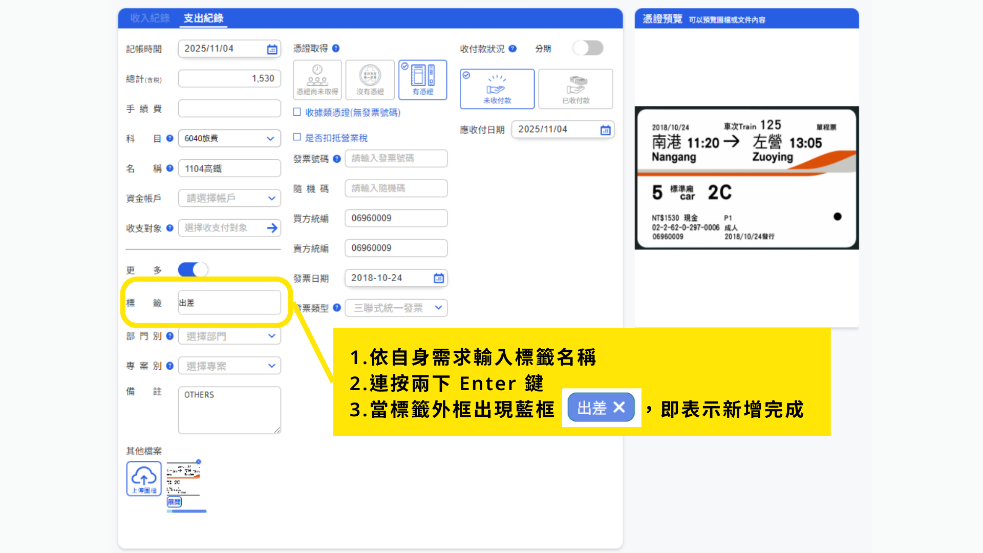 在「建立帳務」時,可依自身需求輸入「標籤」。輸入完成後,連按兩下 Enter 鍵,出現藍色框線即表示標籤新增成功。