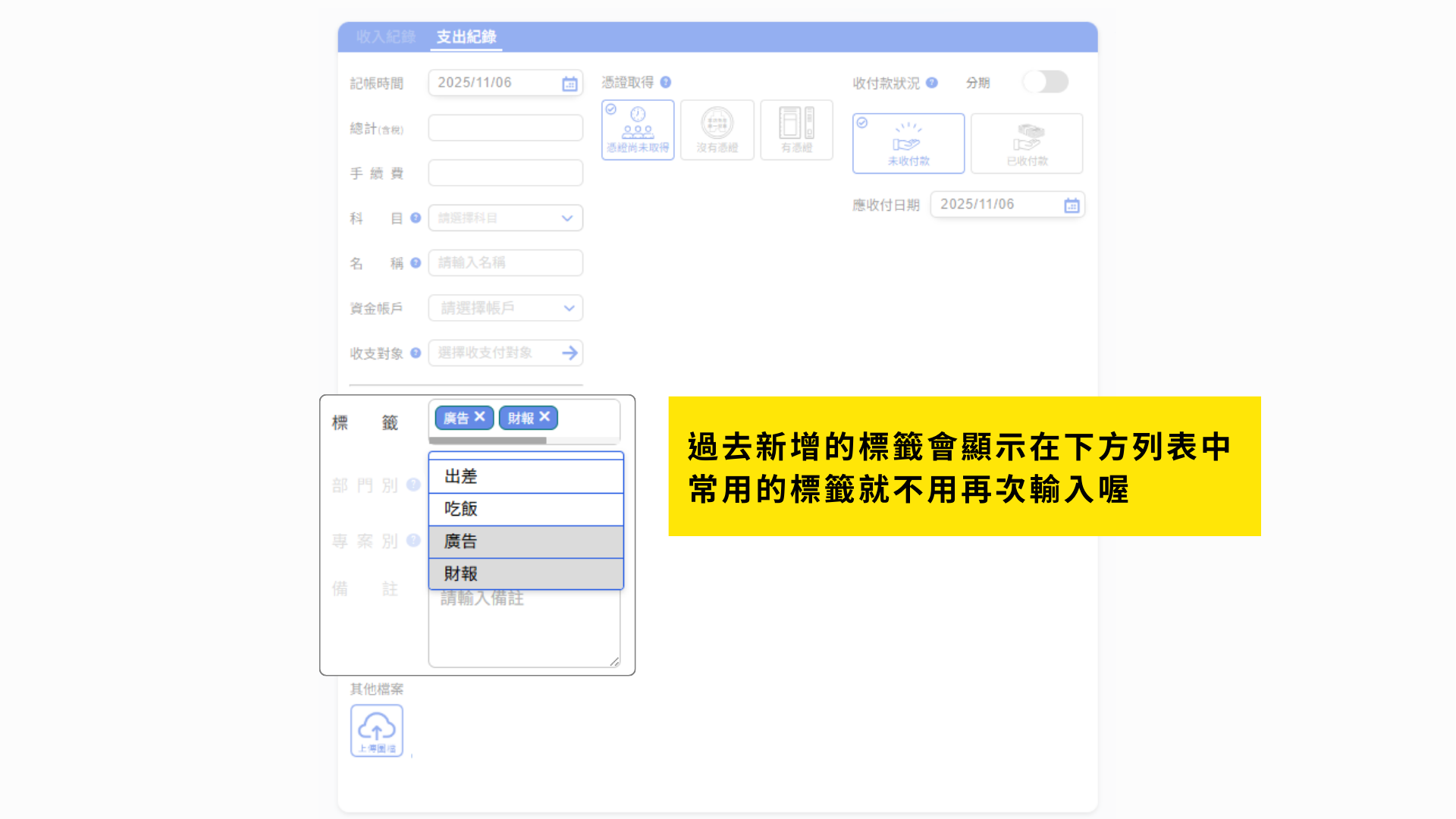 自訂完的標籤不用再重新輸入,點擊標籤輸入欄後,底下將會有過去的標籤資料,可以直接做選擇喔!