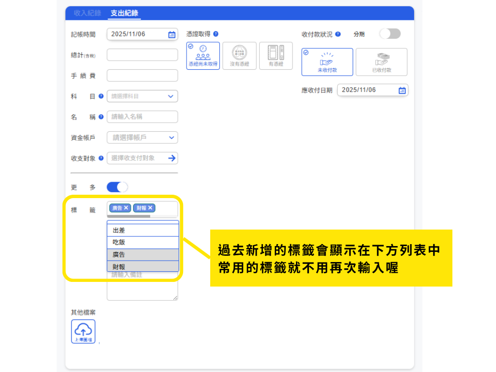 自訂完的標籤不用再重新輸入,點擊標籤輸入欄後,底下將會有過去的標籤資料,可以直接做選擇喔!