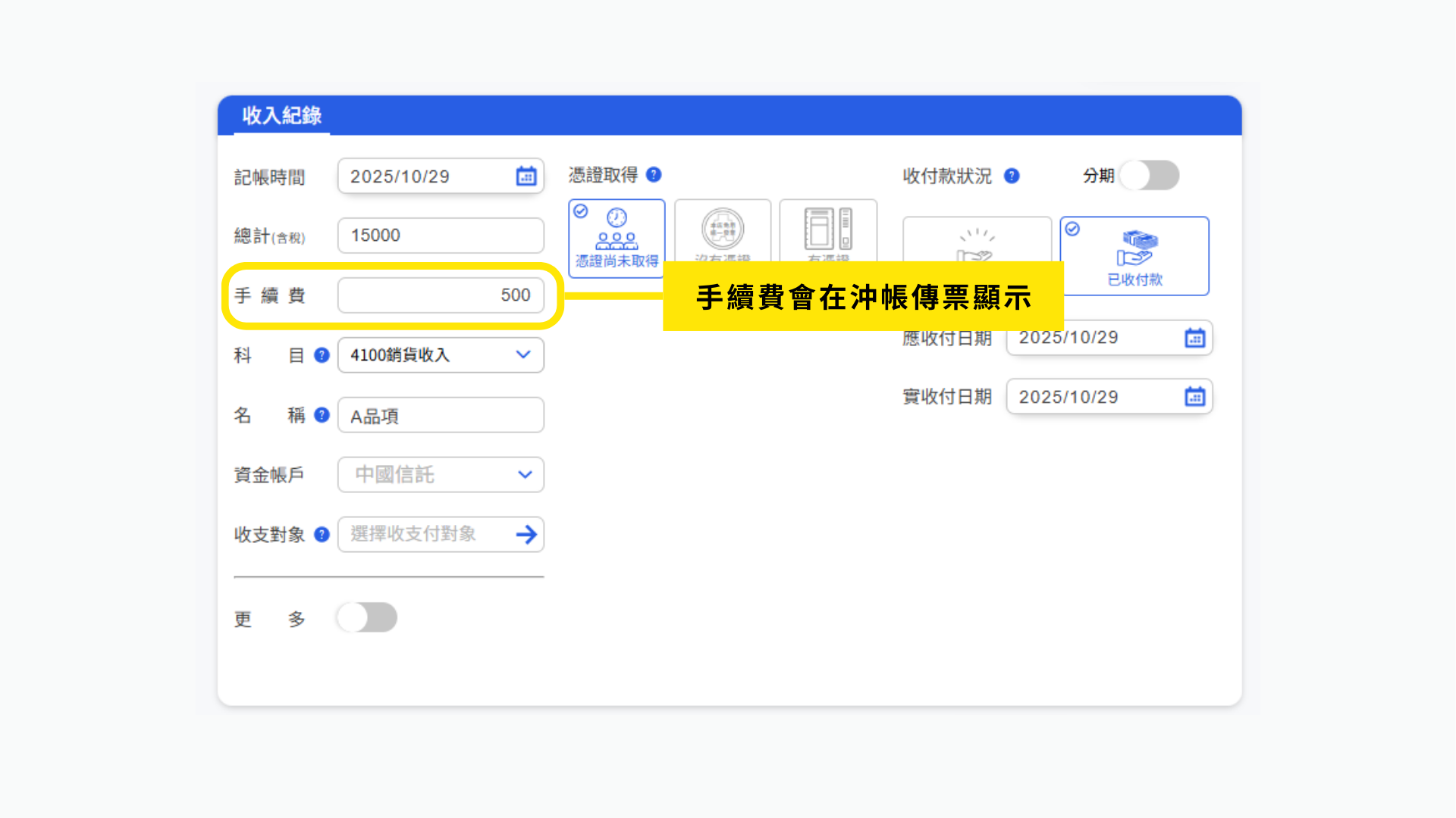 手續費也會顯示在沖帳傳票中。