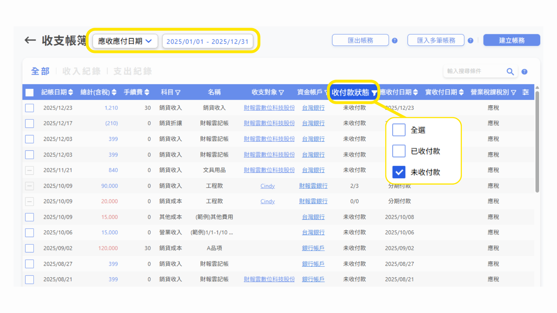篩選日期:應收應付日期 2025/01/01~2025/12/31