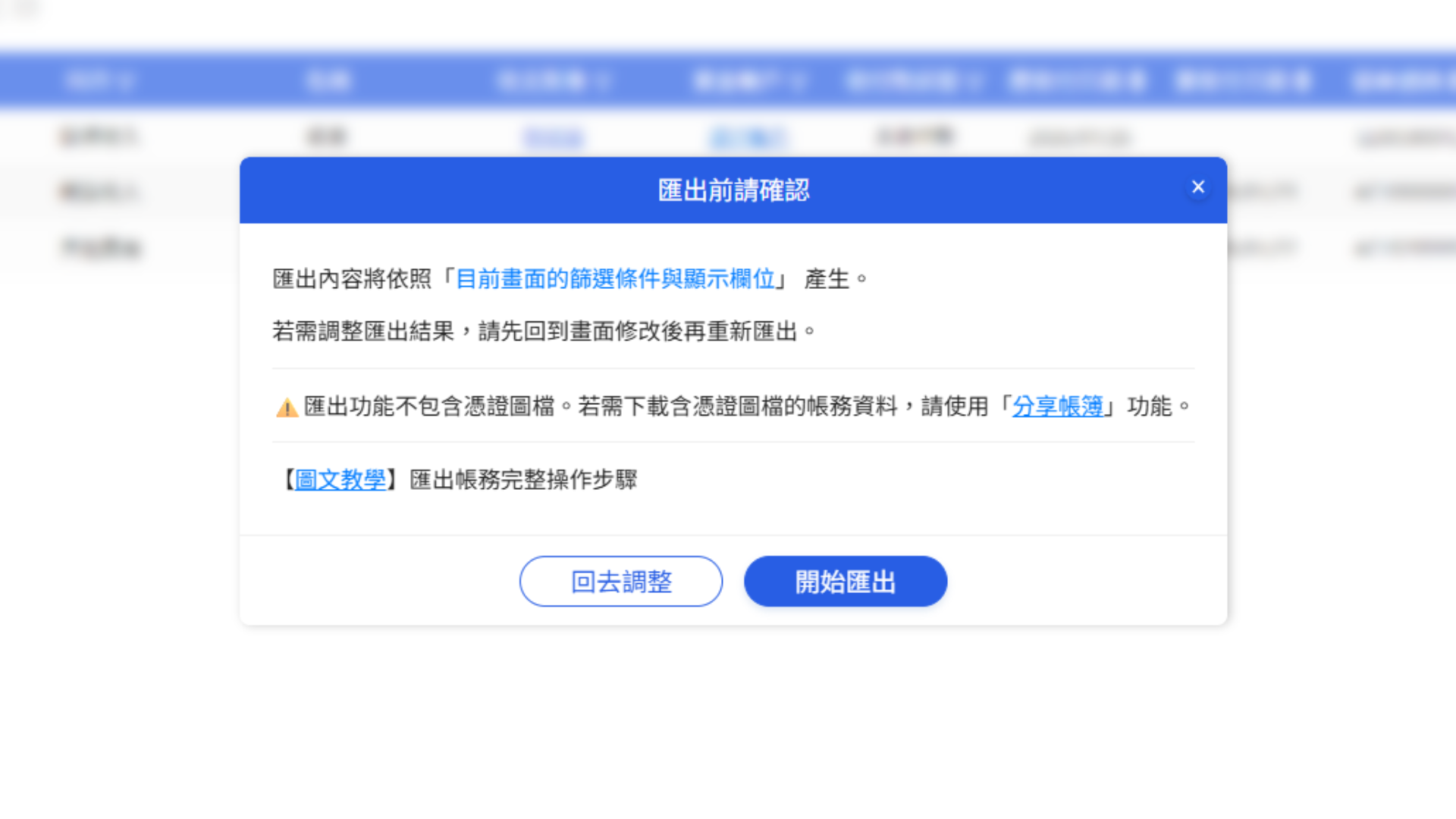 系統會跳出匯出確認視窗,確認內容後點擊「開始匯出」。