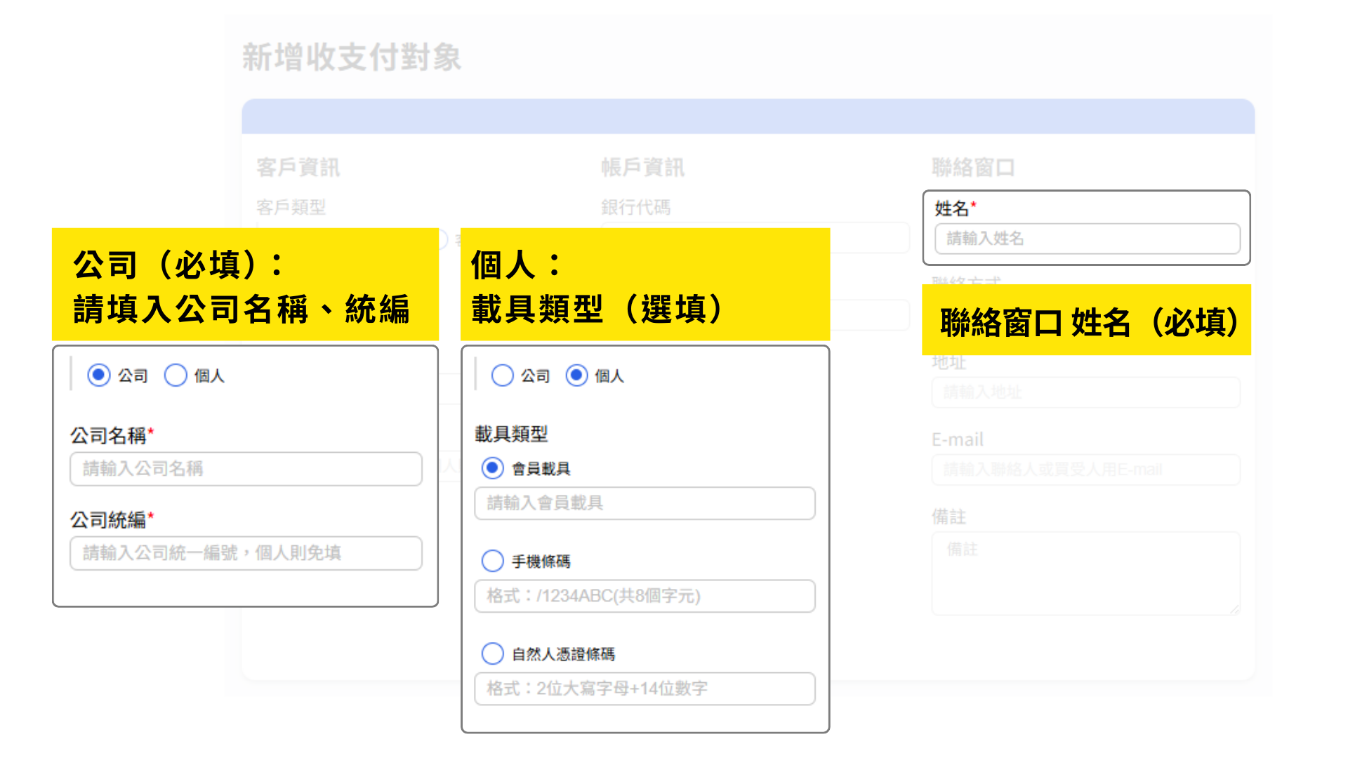 依照實際狀況輸入「客戶資訊」、「帳戶資訊」、「聯絡窗口」。
