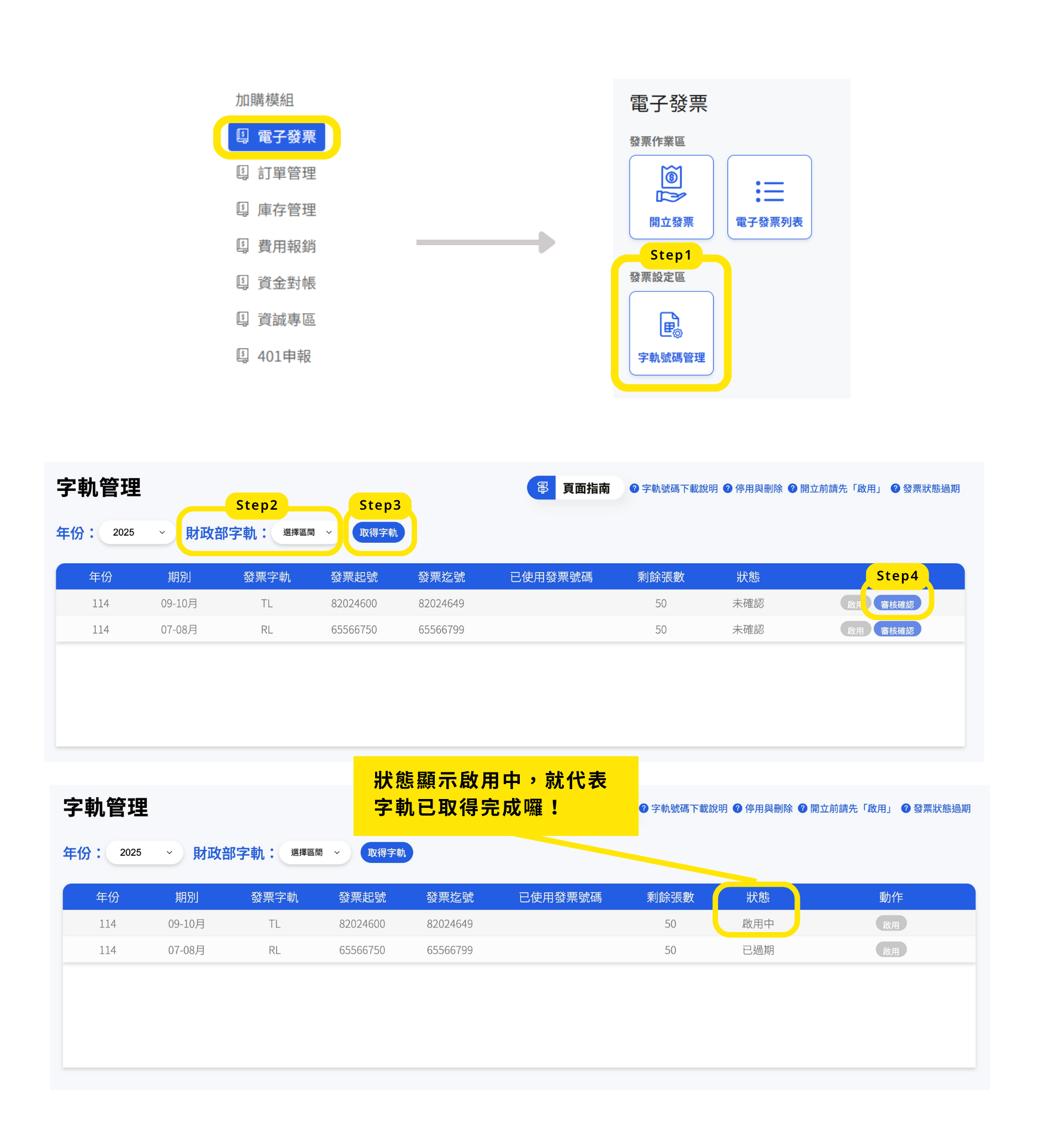 選擇區間後按下「取得字軌」,系統會顯示您目前可用的字軌本數。請依自身需求點擊「審核確認」,當狀態顯示「啟用中」時,即代表字軌已取得完成。