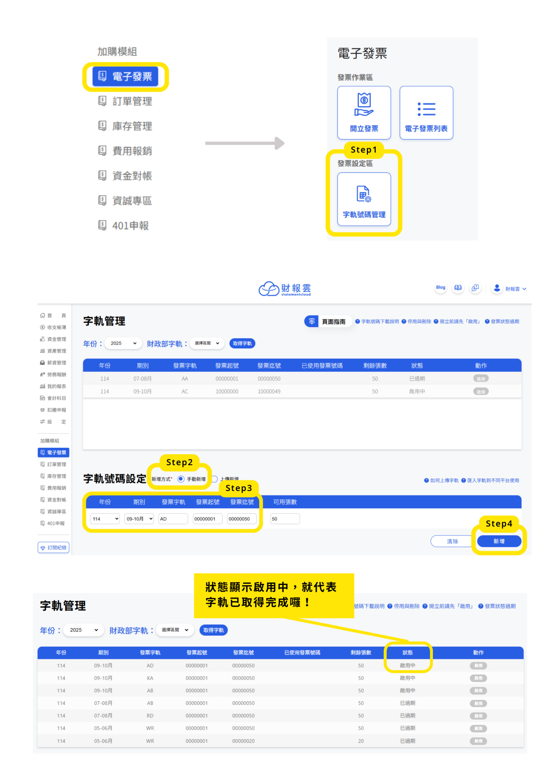 ●「審核確認」是用來確認此字軌是否授權字軌給【財報雲】使用。之後開立發票,系統會依「啟用中」的字軌進行開立。