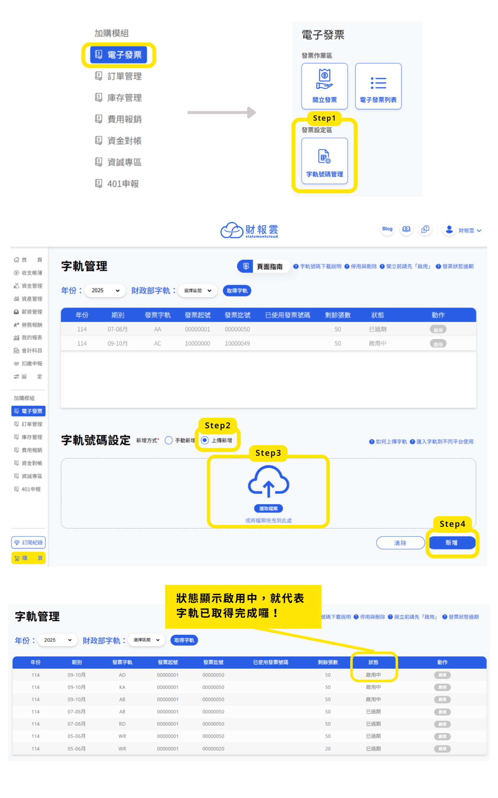 完成第一次取號(新電子發票用戶)或授權加值中心(已申請過電子發票)後,接著只要在【財報雲】上傳字軌,就能開始開立電子發票囉!